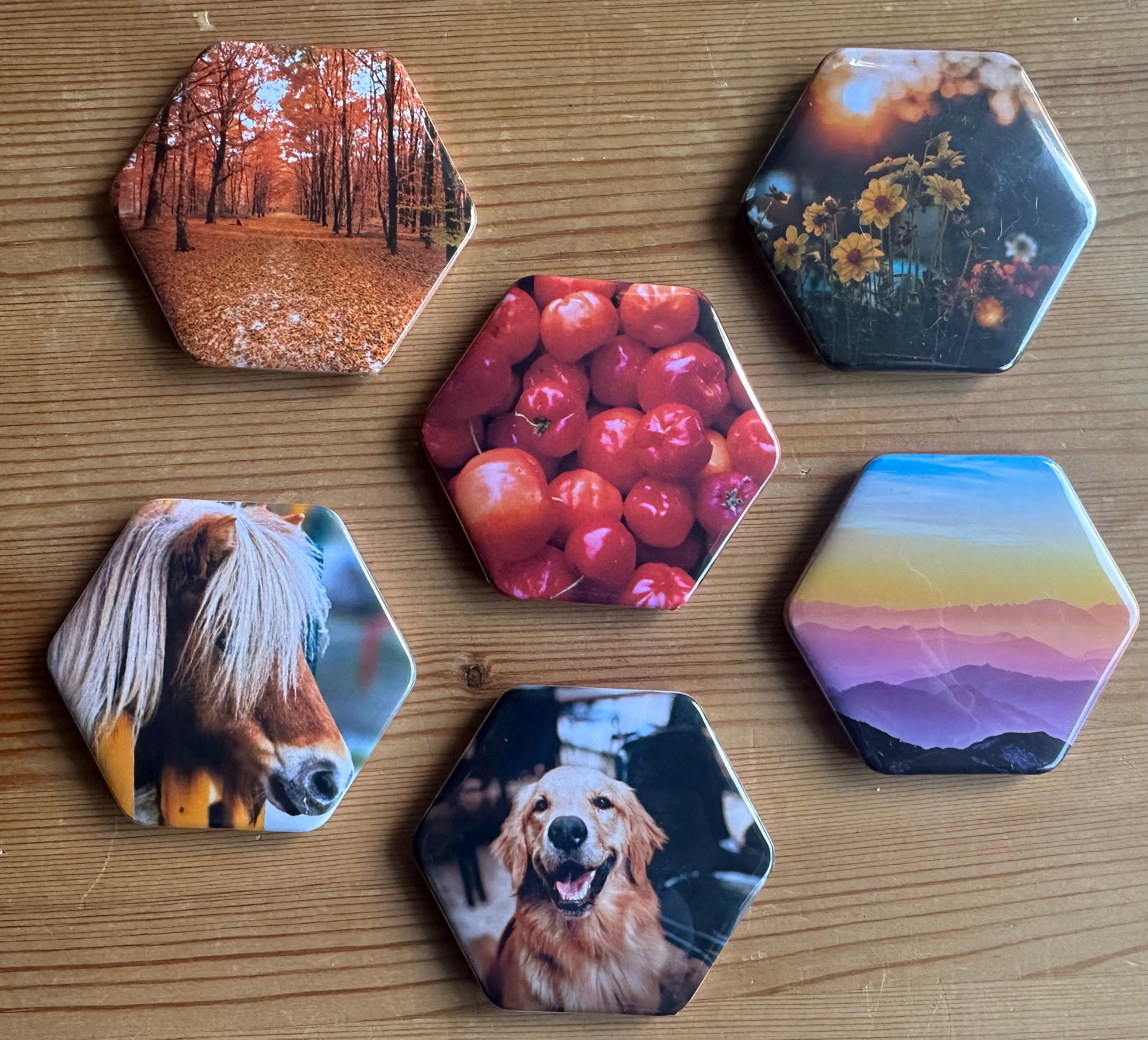 Custom made hexagon photo magnets 65x58mm, pack of 6